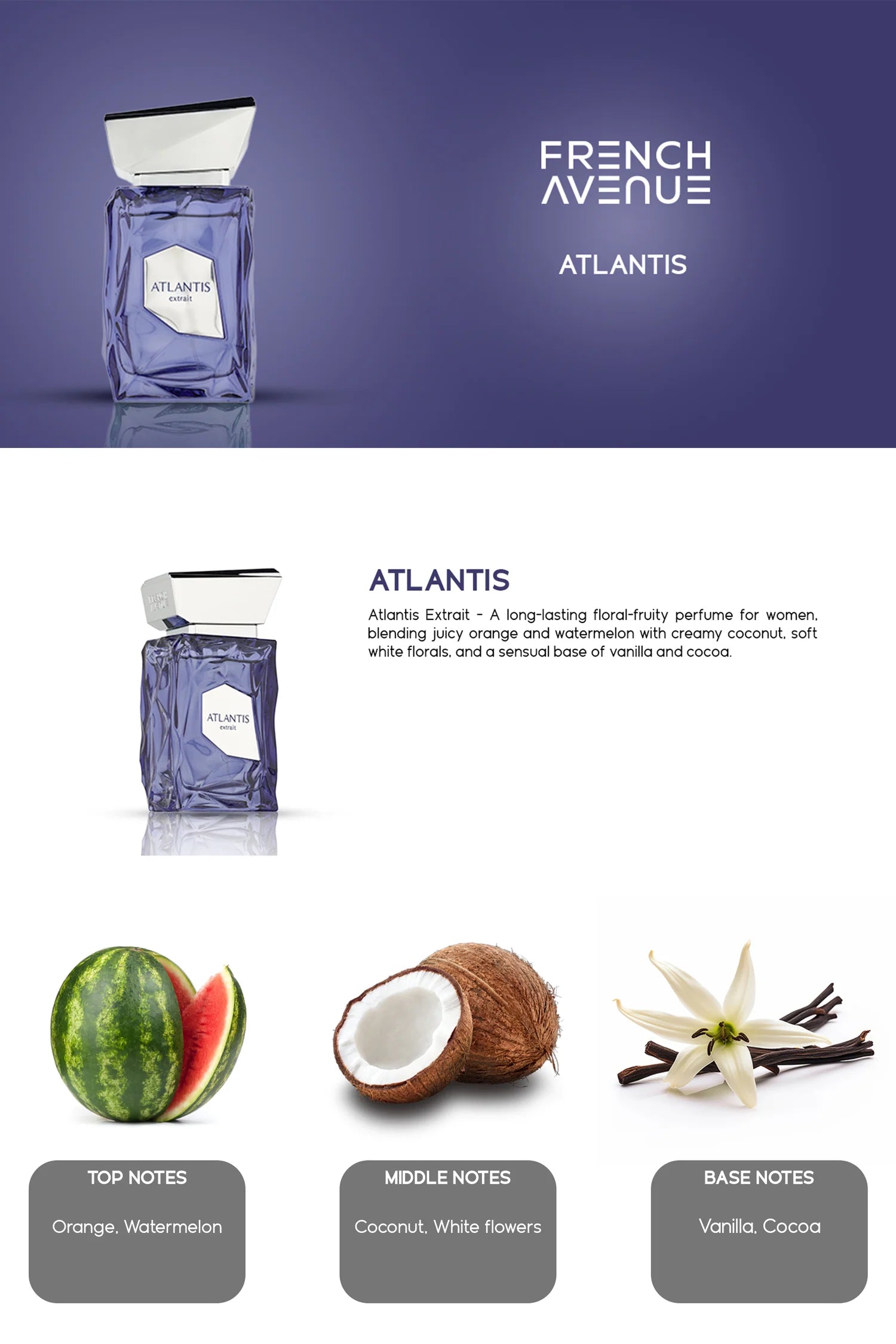 French Avenue Atlantis Extrait is an aromatic aquatic unisex fragrance known for its fresh, tropical, and oceanic vibe, balancing zesty citrus (orange, lemon, mandarin) with fruity watermelon, creamy coconut, and a warm ambergris/cacao base. Launched in 2025, it offers a long-lasting, sophisticated, and breezy scent perfect for summer.
